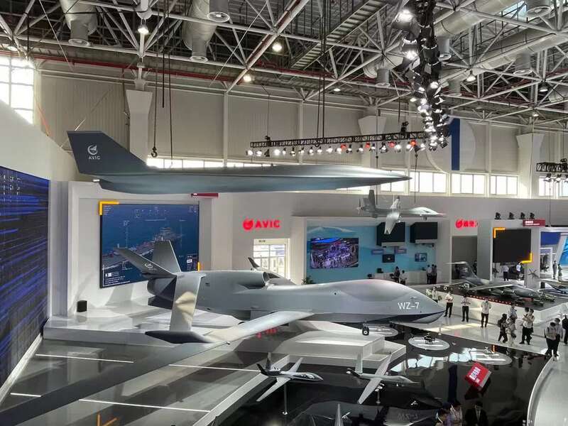 航空工业展馆内,在“中国力量”察打与协同分展区,该款高空高速无人机缩比模型高高挂起,和航空工业自主研制的成体系展示的无人机系统一道,向观众传递着代表未来战争发展方向的力量。