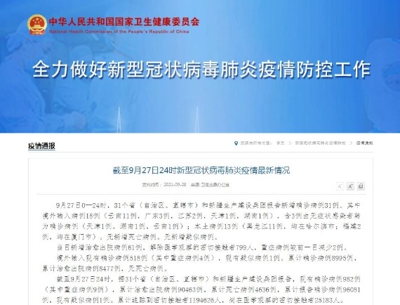 网站截图 中国网9月28日讯 据国家卫健委网站消息,9月27日0—24时,31个省(自治区、直辖市)和新疆生产建设兵团报告新增新冠肺炎确诊病例31例。其中境外输入病例18例(云南11例,广东3例,江苏2例,天津1例,湖南1例),含3例由无症状感染者转为确诊病例(天津1例,湖南1例,云南1例);本土病例13例(黑龙江11例,均在哈尔滨市;福建2例,均在厦门市)。无新增死亡病例。无新增疑似病例。 当日新增治愈出院病例61例,解除医学观察的密切接触者799人,重症病例较前一日减少2例。 境外输入现有确诊病例518例(其中重症病例4例),现有疑似病例1例。累计确诊病例8995例,累计治愈出院病例8477例,无死亡病例。 截至9月27日24时,据31个省(自治区、直辖市)和新疆生产建设兵团报告,现有确诊病例982例(其中重症病例9例),累计治愈出院病例90463例,累计死亡病例4636例,累计报告确诊病例96081例,现有疑似病例1例。累计追踪到密切接触者1194626人,尚在医学观察的密切接触者25183人。 31个省(自治区、直辖市)和新疆生产建设兵团报告新增无症状感染者7例(均为境外输入);当日转为确诊病例3例(均为境外输入);当日解除医学观察11例(均为境外输入);尚在医学观察的无症状感染者337例(境外输入327例)。 累计收到港澳台地区通报确诊病例28461例。其中,香港特别行政区12196例(出院11897例,死亡213例),澳门特别行政区67例(出院63例),台湾地区16198例(出院13742例,死亡842例)。