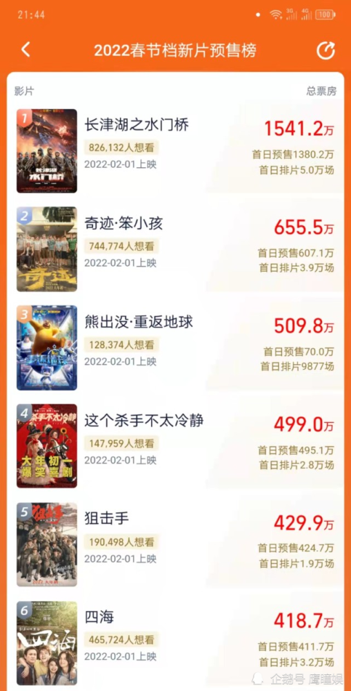 1月21日,离2022年春节只剩10天,春节档预售如期开启,春节档票房大战正式开启。而在预售开启不到12个小时,总票房就突破4454万,这票房比当天上映的实时票房相当。而「票房之王」《长津湖》的续集《水门桥》预售票房占据三分之一,以1537万领跑。 《长津湖之水门桥》被称为春节档当之无愧的热片,排在在淘票票、猫眼等购票平台上的想看人数排在春节档诸片之首。而看过电影《长津湖》的观众都知道,此片的战争场面看起来的确是很震撼,但有些地方还是略显「粗糙」。还有此片的剧情散乱不完整,没有展现出「长津湖战役」最煽情的部分,也没有给出几位主角一个明确的结局。 因此,在影片《水门桥》中,「第七穿插连」的战士们乘胜追击,即将在美军撤退路线上的咽喉之处水门桥阻击敌军。七连战士将如何在冰天雪地中完成任务,千里、万里两兄弟又能否在春暖花开时回到老家盖房子,都牵动着影迷的心。 其实,对于《长津湖之水门桥》预售票房拿下冠军这件事,网友们似乎并不意外,毕竟,《水门桥》自从8天前定档后,想看人数就已经成功突破了80万,将定档很久的《奇迹·笨小孩》《四海》《这个杀手不太冷静》甩在身后,所以,预售票房夺冠也在意料当中。 据电影平台显示,《长津湖之水门桥》现在的最高预测票已经达到了75亿,比前作多出了近18亿。按照现在的汇率,将75亿换算成美元是11.8亿。11.8亿美元的票,放在全球电影票排行榜中,能够排在第22位,比漫威超级英雄大作《队长3:内战》(全球票11.53亿美元)和环球影业的动画电影《小黄人大眼萌》(全球票11.59亿美元)都要高。 而媒体对于《水门桥》这么看好的原因,无非外乎两个,一个就是档期原因,位于一年之中最重要的「春节档」,一部好的影片能获得好影片,是无可厚非的。而第二个则是因为《水门桥》有着《长津湖》在前边打底,网友对于《水门桥》自然就更看好些。再加上在春节档,并没有其他能打的影片。如果说《水门桥》是春节档第一档,那么像《奇迹》《四海》《狙击手》等影片则是第二档次。所以《水门桥》的预测票房这么高,也就能让人理解了。 而让人意外的是,预售票房排名第二的不是沈腾的《四海》,而是易烊千玺的《奇迹·笨小孩》,看来这个春节档,还真是00后最受瞩目的演员易烊千玺的左右互搏了。原本备受期待的《四海》,预售成绩并不理想,在春节档电影当中排名第六,甚至连《这个杀手不太冷静》都比不过。 而对于喜爱易烊千玺的影迷们来说,《长津湖之水门桥》和《奇迹·笨小孩》谁拿票房冠军都没有关系,因为易烊千玺凭借这两部电影铁定进军百亿票房先生,甚至有可能冲进200亿票房。而现今易烊千玺的个人总票房已经88亿,离百亿票房只差10来亿。 而按照以往春节档票房趋势,结合影片市场号召力,影片上映后,《长津湖之水门桥》单日票房将轻松达到2亿,而《奇迹·笨小孩》单日票房突破1亿也毫无压力,也就是说,春节档票房大战开启3天后,易烊千玺就将成为演员中第13位百亿票房先生。这么看来,不管怎么算,易烊千玺将可能成为这个春节档的最大赢家了。#春节档预售票房#