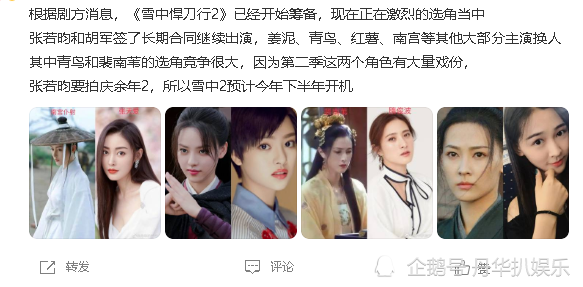 《雪中悍刀行》第一季虽然已经大结局,但网上的热度不减,截止到目前累计播放量已经突破了60亿大关。 能有这么多的播放量得益于原著自带的流量热度和一众人气演员带来的精彩表演,虽然刚开播时被观众吐槽打戏拉胯和选角不当,但并不影响大家的追剧热情,所以当第一季收官后大家便开始期待第二季的到来。 这不,第一季结束不久,网传《雪中悍刀行2》已经开始筹备,目前正在激烈地选角当中。 据这位网友爆料,张若昀和胡军因为签了长期合同继续出演,而红薯、青鸟、南宫、裴南苇等大多数角色都会换人,其中青鸟和裴南苇的选角竞争大,因为这两个角色在第二季都有大量的戏份。 由于张若昀要拍《庆余年2》,所以《雪中悍刀行2》的开机时间预计在今年下半年。 对于这位网友的爆料,丹姐觉得有一定的可信度。 首先,《雪中悍刀行》原著总共400多万字,按照第一季的进度还没拍到三分之一。 其次,第一季就获得了60亿的播放量,不管是制片方还是播出平台都凭这部剧赚得盆满钵满,剧方对于这样的优质项目怎能轻易放弃,所以有第二季几乎是肯定的。 前段时间鹅厂公布的片单中就有《庆余年2》,网上也有消息称《庆余年2》已经开机,张若昀回归继续出演范闲。 而张若昀在《雪中悍刀行》中的表现不错,剧方不会轻易更换主角,所以他继续出演徐凤年的几率很大,为了等张若昀拍完《庆余年2》,《雪中悍刀行2》推到今年下半年开机实属正常。 说完开机时间我们再来聊聊选角换人的问题。 女主姜泥第一季由00后小花李庚希饰演,李庚希从开播到收官一直被观众吐槽,无论是颜值还是气质都与原著中的姜泥相差甚远,而且她的演技也有待提高,如果第二季被换无可厚非。 南宫和红薯在第一季就没什么戏份,红薯只出场了几个镜头,所以孟子义大概率不会继续出演。 而张天爱本身自带关注度和流量,又是剧中的颜值担当,本以为她在第一季中会大放异彩,可是却被观众吐槽只是一个“送刀”的酱油角色,对于张天爱这种人气女星来说,第二季应该不会继续出演这种打酱油的角色。 除了女主姜泥,第一季的裴南苇也是被观众吐槽选角严重不符。 原著中的裴南苇国色天香,年纪虽大但风韵犹存,“天下第一”的徐凤年见到她也只能扶着墙出去。 可剧中隋俊波饰演的裴南苇面容清瘦,皮肤偏黑,侧面看还有点像男的,和原著中裴南苇的人设相差太大,所以第二季被换掉几乎是板上钉钉。 裴南苇这个角色有很高的话题热度, 如果换人的话竞争会很大,有网友建议换成朱珠来演,丹姐觉得这个建议还是不错的。 最后我们来说说第一季人气最高的女性角色青鸟。 青鸟虽然不是女主,但剧中的戏份比女主还多,从第一集到最后一集她一直跟在徐凤年身边,而且观众对于这个角色清一色的好评,年轻演员丁笑滢凭借青鸟一角获得了极高的关注度,成功出圈。 不出意外青鸟在第二季还会拥有大量的戏份,加上讨喜的人设,这个角色必定会引起各大女星争抢,因此丁笑滢未必能保住这个角色,如果青鸟换人,那么对于观众来说是个遗憾。 一部影视剧要拍续集都会面临角色换人的问题,不过对于大部分观众来说,看续集都希望演员是原班人马,一部剧的成功是演员和剧本的相互成就。 就算观众再讨厌一位演员,看完一季也已经习惯了,续集演员换了容易让人出戏。 所以,丹姐希望《雪中悍刀行2》不要换演员,最起码主要角色不要换。 对于网传的多数角色被换,大家怎么看?
