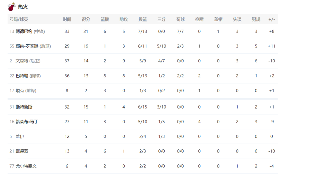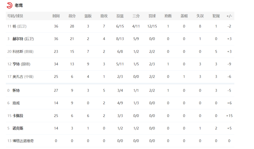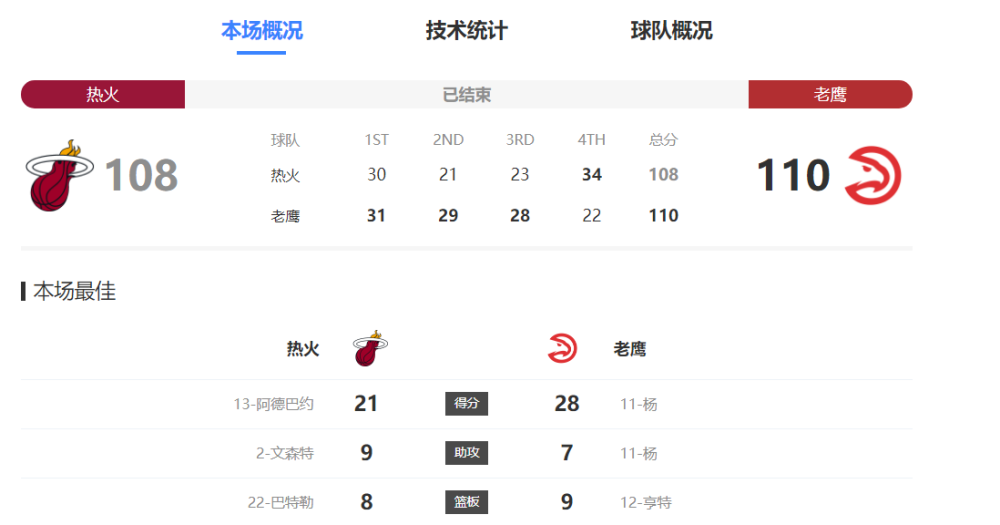 北京时间1月22日,NBA常规赛继续进行,热火客场挑战老鹰。此役热火抢得开局,老鹰在首节末段和次节发力,特雷-杨携手科林斯半场轰下28分,老鹰第三节一度领先18分。末节曾手握16分优势的老鹰却突然断电,热火疯狂反扑追至1分差距,但巴特勒面对空篮的空接未能打成,随后又错失绝杀三分,最终老鹰以110-108赛季首胜热火,取得3连胜的同时终结对手2连胜。 本场数据 热火:阿德巴约21分6板5助、罗宾逊19分、斯特鲁斯15分、文森特14分9助、巴特勒13分8板8助、马丁11分 老鹰:特雷-杨28分7助8失误、赫尔特21分、科林斯15分7板、亨特13分10板 本场之星:瑕不掩瑜!特雷-杨率老鹰惊险取胜 此役,特雷-杨可以是魔鬼与天使合体,全场个人进攻和传导球都表现出色,但出现多次失误,尤其是末节的连续断电险些葬送比赛。好在老鹰最终有惊无险,特雷-杨的表现也瑕不掩瑜,帮助球队延续连胜脚步。 比赛花絮 巴特勒关键空接空篮不中!热火最后15秒错失反超良机本场高光 轻松飞扣!热火快攻巴特勒无人看管 张手命中!特雷-杨开局就送超远三分 蝴蝶穿花!特雷-杨戏耍塔克上篮得手 内线之间的喂饼!科林斯助攻卡佩拉轻松取分 空切隔扣!巴特勒无视奥孔古防守 一条龙打成!阿德巴约突破篮下得手比赛回顾 首节比赛,邓罗和赫尔特对飚三分,科林斯送暴扣,邓罗两罚全中,热火连取6分,特雷-杨送上超远三分,老鹰8-9落后。邓罗三罚两中,卡佩拉篮下打成,文森特连续命中三分,科林斯回敬三分,老鹰14-19落后。老鹰突然发力轰出一波8-2反超1分,斯特鲁斯送上三分,赖特三分再中,斯特鲁斯三分再中,随后科林斯抛投命中,老鹰26-27落后。文森特送上和路威对飚三分,随后路威篮下打成,老鹰31-30领先进入次节。 次节伊始,赖特送上三分,文森特突破打成,斯特鲁斯中投打成,赫尔特送上三分,斯特鲁斯上篮命中又送上三分,热火追至39-40。科林斯暴扣拉开分差,特雷-杨送上三分,随后路威和科林斯连取4分,老鹰轰出一波11-2拉开10分差距。阿德巴约打成2+1,特雷-杨再送三分又两罚一中,老鹰55-44领先。亨特再中三分,阿德巴约补篮命中,科林斯两罚全中,马丁送上三分,斯特鲁斯送上压哨补篮,老鹰60-51领先进入下半场。 易地再战,亨特和赫尔特连送抛投,尤特赛文和巴特勒回敬两记暴扣,阿德巴约篮下打成又两罚全中,热火追至59-64。巴特勒和特雷-杨对飚三分,尤特赛文暴扣打成,赫尔特送三分,亨特打成2+1,老鹰77-64领先13分。阿德巴约篮下打成,随后赖特送上三分,亨特两罚一中,阿德巴约两罚全中,特雷-杨两罚全中,斯波吃T再送一记罚球,老鹰86-70领先。随后特雷-杨两罚全中,热火落后18分。盖伊跳投打成,戴德蒙送补扣,热火74-88落后进入末节。 末节决战,盖伊三分先拔头筹,戴德蒙篮下打成,热火追至79-88。但随后老鹰突然发力轰出一波7-0再度拉开16分差距,阿德巴约连送两记暴扣,诺克斯三分命中,老鹰98-83领先后突然陷入哑火,热火轰出一波8-0追至91-98。随后老鹰连取4分拉开11分差距,文森特和赫尔特对飚三分,巴特勒篮下打成,邓罗命中三分,阿德巴约上篮打成,热火追至101-105。随后特雷-杨两罚全中,阿德巴约回敬中投,巴特勒两罚全中,热火追至105-107。卡佩拉吃饼打成,邓罗送三分,老鹰109-108领先。随后热火打出完美配合,但巴特勒空篮空接不中,最后15秒落后1分的他们被迫采取犯规战术,特雷-杨两罚一中,老鹰最后10秒110-108领先2分。巴特勒三分不中,热火吞下憾负。 双方首发 热火:文森特、邓肯-罗宾逊、吉米-巴特勒、PJ-塔克、阿德巴约 老鹰:特雷-杨、赫尔特、亨特、约翰-科林斯、奥孔古