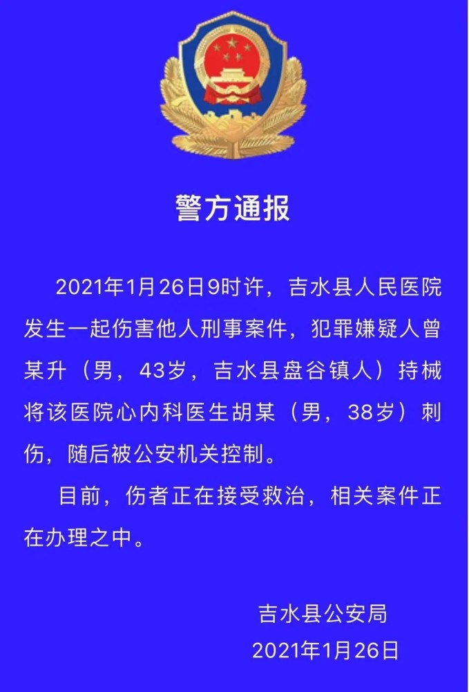 1月26日,据江西省吉水县公安局通报,当天9时许,吉水县人民医院发生一起伤害他人刑事案件,犯罪嫌疑人曾某升(男,43岁,吉水县盘谷镇人)持械将该医院心内科医生胡某(男,38岁)刺伤,随后被公安机关控制。
