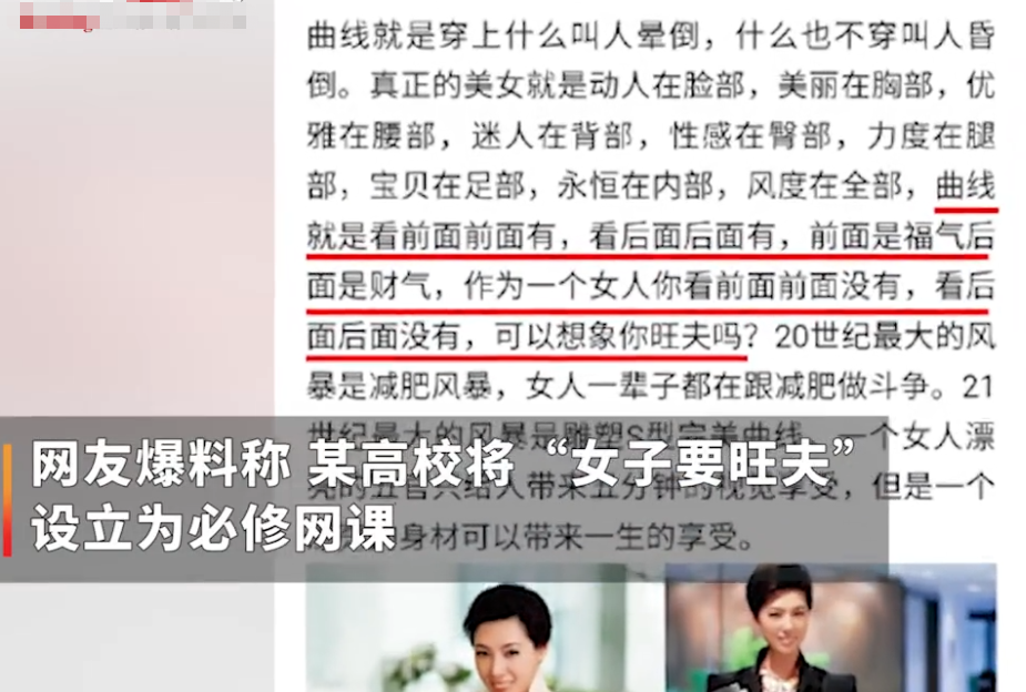 1月29日,天津一网友爆料称,某高校将“女子要旺夫”设立为必修网课。据记者了解“形象管理”课是跟某平台合作的共享课。 高校工作人员表示,这个老师开了一个共享课,叫形象管理。这位老师自己跟超星那边合作,应该是录了一些网课。她这个没有要求必须上,再有一个是教学质量科已经去看了。是不是符合咱们这种正能量。 随后记者在“形象管理2020秋季班”得知课程内容并非学校王老师所写,而是2013年某平台编写与学校无关。 对此,不少网友表达了自己的看法:“社会要求女性如何做一个好妻子,怎么不教那些出轨家暴的男性如何做一个好丈夫。” 还有网友表示:应该有婚姻课。男人需要被尊重,女人需要被爱。我认为这样的课程很实用。有多少相爱的人婚后不忠,或因生活必需品和婆媳关系而变得不和谐?我认为提前了解这些课程很好。 再者贤妻少祸事,这就是福,是福就旺夫。没必要上纲上线,取其精华去其糟粕,仁者见仁智者见智。钻牛角尖,听毒鸡汤,苦甜自知,福祸自受。 根据网友的意见,从某个角度来说没有错,因为每个人都有自己不同的看法。换言之,为什么现在像“女子教育”这样的课程那么多?有没有严格的监管?这种屡禁不止,有什么样的社会、道德、它反映了什么样的社会问题?令人深思。对于这一问题大家是怎么看的呢?