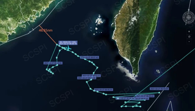 2月27日早上,美国空军一架RC-135U战略侦察机从冲绳起飞,经巴士海峡前往中国广东外海侦察,据ADS-B信号,最近距离中国划定的领海基线约为46.65海里,真实情况也许更近。该机是美国空军的“压厢底”侦察机,全球仅有2架。