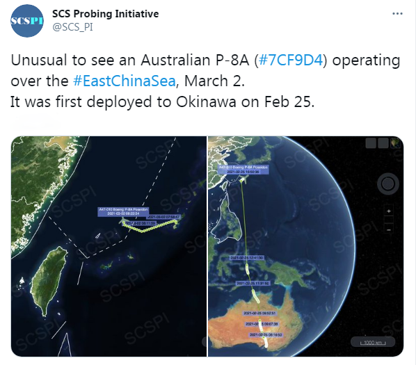 【环球网军事报道】据“南海战略态势感知”计划平台3月2日报道,当日上午,澳大利亚空军1架P-8A反潜巡逻机(7CF9D4)进入东海空域活动。这是该机自2月25日从澳大利亚部署至冲绳嘉手纳基地以来的首次行动,其目的有待进一步观察。 据了解,澳大利亚自2月以来进一步加强与日本的防务合作,日本共同社与《澳大利亚人报》2月底报道,日本首相菅义伟25日与澳大利亚总理莫里森举行电话会谈,就中国加强海洋活动问题,双方确认将保持紧密合作。此外,日本新任驻澳大利亚大使山上信吾也搬出印太地区安全问题宣称,扩大日澳安全合作对“对抗中国至关重要”。 山上信吾还回顾起去年“马拉巴尔”军演。“日本很高兴澳大利亚去年参加了印度、美国和日本的‘马拉巴尔’海上演习,这是13年以来的首次。” 《澳大利亚人报》援引日本驻澳大使的话称,(日澳)安全合作对“对抗中国至关重要” P-8A反潜巡逻机除了澳大利亚之外,近期美军也派出大量侦察机舰对中国实施抵近侦察,在2月24日、25日、27日美军分别派遣MQ-4C海上侦察无人机,EP-3E侦察机和一架RC-135U战略侦察机飞往南海。而在26日,美海军“无暇”号测量船被发现南海西沙群岛附近活动。法国也趁势跟进,派出两栖攻击舰和护卫舰前往南海,同样在2月底,法美日三国还在日本附近开展联合演练 日媒称有意牵制中国。有分析人士指出,“美国正试图通过将其西方盟友集结到南海来遏制中国,其政治意义大于军事意义。” 针对上述多国进行军事合作挑衅中国的行为,中国外交部发言人赵立坚曾在2月26日应称,国与国之间的军事合作应有利于地区和平稳定,而不是相反。今年1月29日,中国驻墨尔本总领事龙舟在谈及中澳关系时也再次强调,世界各国开展合作的基础是相互尊重。正如王毅国务委员兼外长不久前所说,澳方应该认真思考一个问题,中国到底是澳方的威胁还是伙伴?澳方应客观理性看待中国和中国的发展,摒弃意识形态偏见,切实秉持相互尊重、平等相待的原则处理两国关系,积极推动中澳关系尽早回到正常健康发展的轨道,因为这符合两国共同利益和两国人民的根本利益。