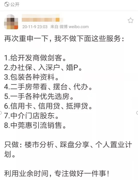 近期,北京倒卖二手房上亿元的“南城房姐”被判无期,深圳最嚣张大V“深房理”以及相关炒房团也被深圳七部门联合调查。这事还上了央视新闻,众多媒体跟进声讨,揭露“深房理”的套路和骗局。一南一北,天雷滚滚。在一拳拳的重击下,炒房客们彻底慌了! 图片来源:央视新闻 炒房大V急着切割和“卧倒” 据中国证券报报道,张峰(化名)2018年杀进深圳炒房,在这一轮房价上涨中“赚了1000万”。最近他发现自己关注的微博大V低调多了:有的人不更新了,一天发不了一条微博;有的人“不务正业”,不谈房子谈起美食。刚开始他不解,直到在炒房的微信群里看到“南城房姐”和“深房理”的新闻。 “南城房姐炒房炒到无期徒刑”“倒腾上亿房产还是栽了”……这样的新闻让张峰悚然心惊,他和炒房的朋友们专门聚了一次,探讨未来的走向,互相安慰说是北京的事情。近期深圳七部门联合调查“深房理”,让他们觉得“天雷在身边炸响”,难怪大V们一反常态。 在深圳,房产大V主要分为两类,一类以“深房理”为代表,他们有专业的团队,为会员提供全流程的购房服务建议,包括落户、购房名额、选房、找小贷公司垫资等,其中每一个环节都需要在中间商身上花钱,而且越往后,抽成的中间商越多。“深房理”入会费为12780元,交了钱便有工作人员在线指导买房。 不过,好景不长,就在4月8日17时,深圳市住建局等7部门联合发布《关于对涉及“深房理”的举报事项进行调查处理的通告》。此次联合调查处理的部门空前壮大,包括深圳市住房和建设局、深圳市公安局、深圳市市场监督管理局、深圳市地方金融监管局、深圳市互联网信息办公室、人民银行深圳市中心支行、深圳银保监局等7部门。 在深圳市住建局等7部门发布通知的半小时前,深房理更改了置顶微博,“刚刚收到律师通知,已经完成申请立案。最近要处理的事情较多,会少更新微博,诸位、见谅!” 晚些时候,当事人深房理独家回复《每日经济新闻》记者采访时表示,首先通告上面说的是涉嫌,是疑似,别人举报了迫于舆论,只能让他们调查。合伙买房和代持买房都不违法的。还有第四条涉嫌虚假广告行为,前段时间就已经在调查了。而在通知发布的40分钟后,下午18时16分,深房理会员群有群友发布消息称,“为了避免不必要的麻烦,本群解散,或重新拉群;大家清除一下聊天记录。” 比起“南城房姐”和“深房理”,还有一类是以“某某木子”“某某他爸”“山某某”等为代表,他们个人“作战”,为会员提供选房建议服务,教人买房。比如,“某某木子”有两个咨询渠道:一是微博提问,问一个问题288元;二是微博V+会员,2688元/年(2088元/半年),权益是可以免费看所有微博会员文章和微博问答,另外有微博群讨论。 这些粉丝五六十万的房产大V最近都发布声明,特别强调自己不是炒房客,也没有教唆别人炒房,更没有非法集资。 另一知名房产大V也表示,只分析楼市,推荐楼盘,没有从事经营贷业务,没有介绍婚票: 有人8折甩卖,有人叫嚣进军二线城市 据中国证券报报道,今年年初,深圳建立二手房成交参考价发布机制,参考价格一般是市场价格的5-8折。显然,正常买房以及不缺乏资金的房主均会惜售,反倒是部分资金紧张的炒房客开始“甩卖”。张峰说,这一轮调控来得很猛,为了能熬得时间长一点,有的同伴不得不出掉一部分货。“有的人手上有四五套,就出一套涨得最差的,既止损又回笼资金。” 中介则推出了一些与政府指导价齐平甚至低于指导价的房源。 记者统计发现,在某房产交易平台上,深圳二手房挂盘信息中,明确表示低于指导价或与指导价持平的房源有29套: 深圳、北京、上海等一线城市打击炒房力度越来越大,有些炒房者把目光转向二线城市,有部分房产大V开始鼓吹去佛山、珠海、中山等地买房。 在微信公众号上,有人发布《定点引爆的佛山》一文,极力推荐佛山千灯湖的房子。同时在文中表示,他们在佛山20多天里“夜以继日”带领炒房客扫货,经过一个月的抢房,千灯湖的房子和年前相比已上涨了20%。 该作者炫耀自己的“业绩”:公司主做二手房选筹代购,2019年初做深圳,去年8月开始做广州。2019年入场的深圳客户盈利普遍在70%-100%,去年入场的也有50%,8到10月入场的广州客户普遍有了百万以上的利润。 住建部约谈5个城市政府,要求坚决遏制投机炒房 据新华社消息,住房和城乡建设部副部长倪虹8日约谈广州、合肥、宁波、东莞、南通等5个城市政府负责人,要求切实提高政治站位,把思想和行动统一到党中央、国务院决策部署上来,充分认识房地产市场平稳健康发展的重要性,牢牢把握房子是用来住的、不是用来炒的定位,不将房地产作为短期刺激经济的手段,切实扛起城市主体责任,确保实现稳地价、稳房价、稳预期目标。 近期广州、合肥、东莞等城市落实主体责任,针对房地产市场升温问题出台了调控措施,对稳定市场起到了一定作用。对此,倪虹指出,要加强实施效果评估,及时完善相关政策,增强调控的针对性、实效性。城市政府要增强工作的积极性、主动性,紧盯新情况新问题,及时采取针对性措施,精准调控,坚决遏制投机炒房,引导好预期,确保房地产市场平稳运行。 他说,要完善人口、土地与住房联动机制,加强与人口落户、义务教育等相关政策的统筹协调,强化二手房交易管理,提高房地产市场调控的系统性、整