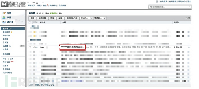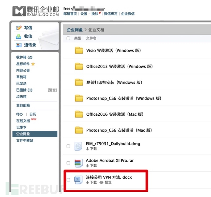 下面有服务器地址,测试了下mail.xxx.com,是腾讯企业邮登录口free@xxx.com虽然是个低权限账号,但是也成功登录了,上面还是有一些邮件没删除,也找到了一些有用的信息,比如,他们的企业邮换系统了、还有老的威PN客户端和连接方式等,还得知了他们新邮件系统的默认密码是他们上网账号的密码。