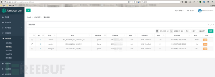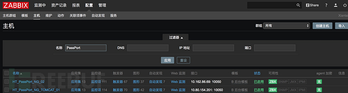 初期在内网无法确定目标机器在内网的名称是啥,因为他们内部两千多台服务器和很多项目,而且命名都不一样,但是获取到了这个zabbix之后,通过搜索passport关键字,确定到了他们内部对主机的命名,是HT_PassPort_NG_02和HT_PassPort_NG_TOMCAT_01:  堡垒机获取到主机名以后,就可以继续去查找目标主机的信息了,刚才在扫c段的过程中,还发现了堡垒机,堡垒机同样也有弱口令,可以直接登录: 堡垒机弱口令:http://192.168.10.136 admin admin在堡垒机中确定了下之前搜集到的主机名确实能跟目标系统的IP对上。
