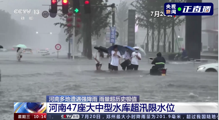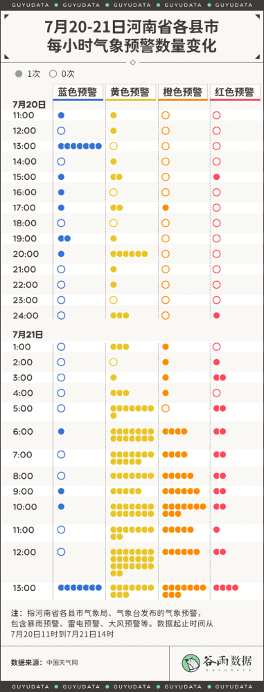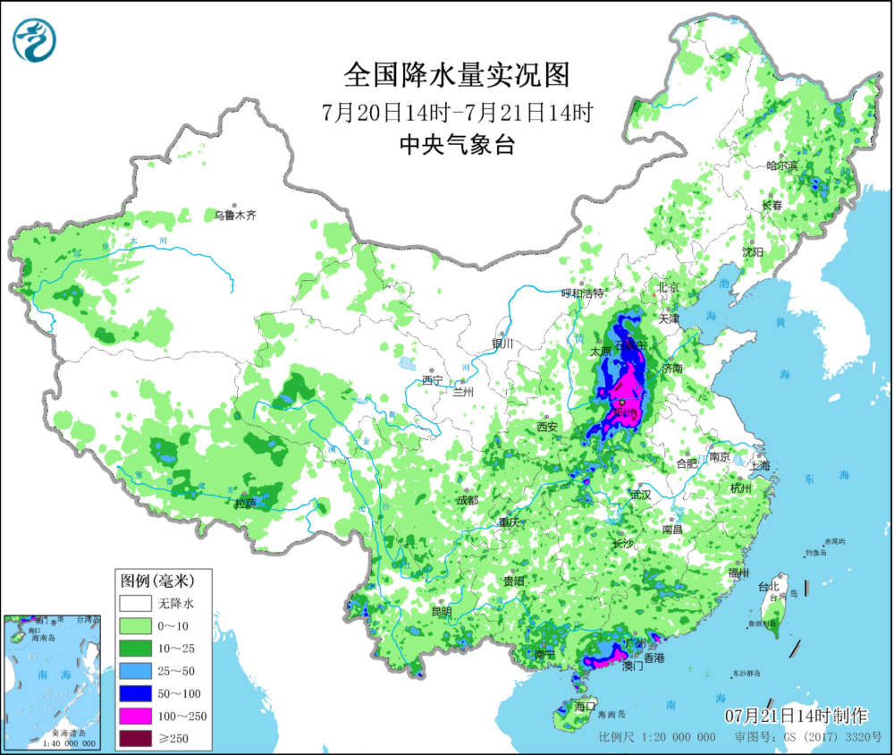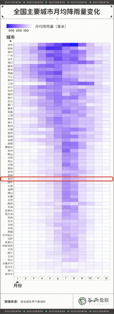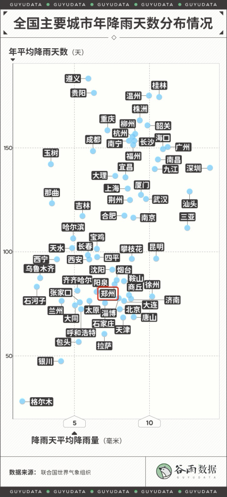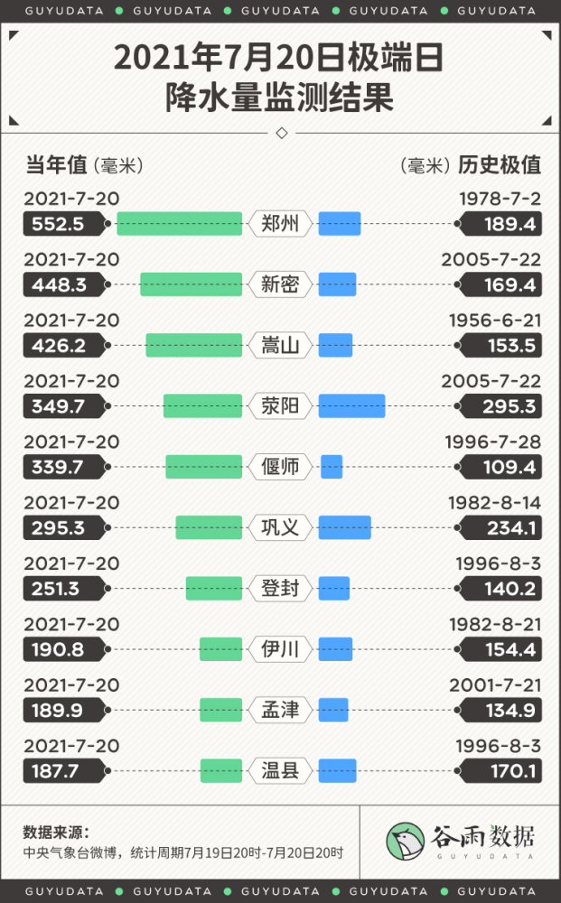 河南的暴雨,牵动着全国人民的心。 郑州市内随处可见的积水和暴雨,街边车辆被洪水卷走,街道上的积水已经没过膝盖。 昨日地铁车厢内部也多处积水,有乘客被困地铁隧道内,车厢内积水上涨到过腰位置。 昨天受到暴雨的影响,河南省妇幼医院停电,工作人员称缺发电机为新生儿监护室供电。 郑州一天下了一年的雨 小时降雨量破全国纪录 中央气象台数据显示,郑州20日08时至21日08时,单日降雨量达到624.1毫米。 624.1毫米是什么概念? 郑州2019年平均年降水量为509.5毫米,相当于一天下的雨比一年的都多。 24小时降雨量超过50毫米即为暴雨,超过100毫米为大暴雨,超过250毫米为特大暴雨。624.1毫米,是特大暴雨标准的两倍多。 20日下午4点到5点之间,郑州1小时雨量高达201.9毫米,打破全国纪录,而之前的最大数据,是广东茂名的168.3毫米。 除了郑州,河南大部分从7月17日开始出现暴雨。强降水主要集中在西部、北部和中部地区,郑州、焦作、新乡、洛阳、南阳、平顶山、济源、安阳、鹤壁、许昌地区出现特大暴雨。 中央气象台丨全国降水量实况图截至7月21日14时,中国天气网已经发布多个暴雨或雷电预警通知。 河南多地日降雨量突破历史极值根据中央气象台数据,19日20时至20日20时,郑州、新密、嵩山、荥阳、偃师、巩义、登封、伊川、孟津、温县共10个国家级气象观测站日雨量突破有气象记录以来历史极值。 而郑州的月均降雨量、降雨总量和降雨天数在往常都并不突出。郑州的年平均降雨天数只有84天,降雨天平均降雨量低于10毫米。 从降雨量上看,排名前三的城市分别是深圳、桂林和温州。 从降雨天数上看,拔得头筹的则是遵义、贵阳。 虽然每次下起雨来,雨量不像深圳、汕头、三亚那么“暴力”,但是下雨的时间是真的长,超过170天。相当于全年里,每2天就会有1天会下雨。 第三、四名是温州和桂林,这两个城市属于不仅下雨下得长,雨量也大。 为什么是郑州遭遇千年一遇的暴雨 按常规来看,郑州远不可能会是暴雨的中心。那为什么这次千年难遇的暴雨降在了郑州呢? 中国气象局也解释了此次雨情产生的原因: 一是大气环流形势稳定。西太平洋副热带高压和大陆高压分别稳定维持在日本海和我国西北地区,导致两者之间的低值天气系统在黄淮地区停滞少动,造成河南中西部长时间出现降水天气。 二是水汽条件充沛。7月中旬河南处于副高边缘,对流不稳定能量充足,18日西太平洋有台风“烟花”生成并向我国靠近。受台风外围和副高南侧的偏东气流引导,大量水汽向我国内陆地区输送,为河南强降雨提供了充沛的水汽来源,降水效率高。 三是地形降水效应显著。受深厚的偏东风急流及低涡切变天气系统影响,加之河南省太行山区、伏牛山区特殊地形对偏东气流起到抬升辐合效应,强降水区在河南省西部、西北部沿山地区稳定少动,地形迎风坡前降水增幅明显。 四是对流“列车效应”明显。在稳定天气形势下,中小尺度对流反复在伏牛山前地区发展并向郑州方向移动,形成“列车效应”,导致降水强度大、维持时间长,引起局地极端强降水。 根据中央气象台消息,河北的降雨还将持续到7月22日夜间: 7月21日08时至22日08时,河南中北部、河北中南部、山西东部以及广东中西部沿海、广西东南部、海南岛西北部、云南南部等地的部分地区有暴雨到大暴雨。 其中河南北部、河北南部局地有特大暴雨(250~280毫米),上述部分地区伴有短时强降水(最大小时降雨量30~50毫米,局地可超过70毫米),局地有雷暴大风等强对流天气。